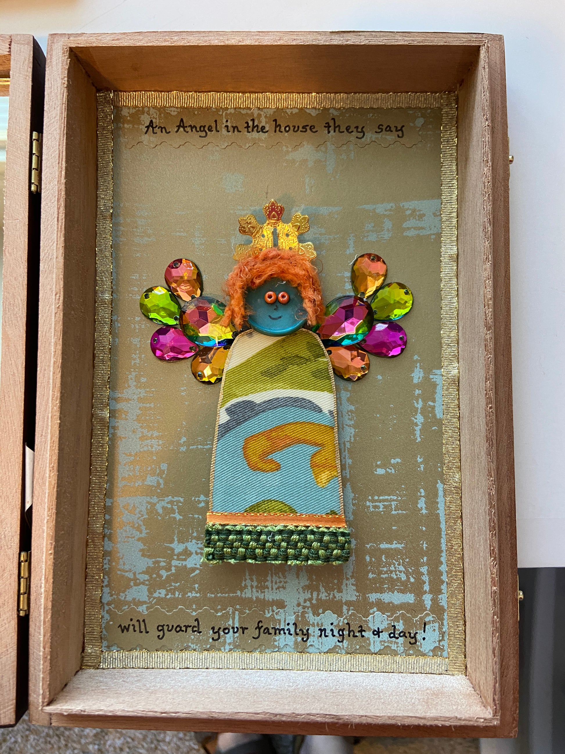 3 Dimensional Angel recessed inside a cigar box with a mirror on the other side. She sits on a countertop/dresser and measures 11" x 9".