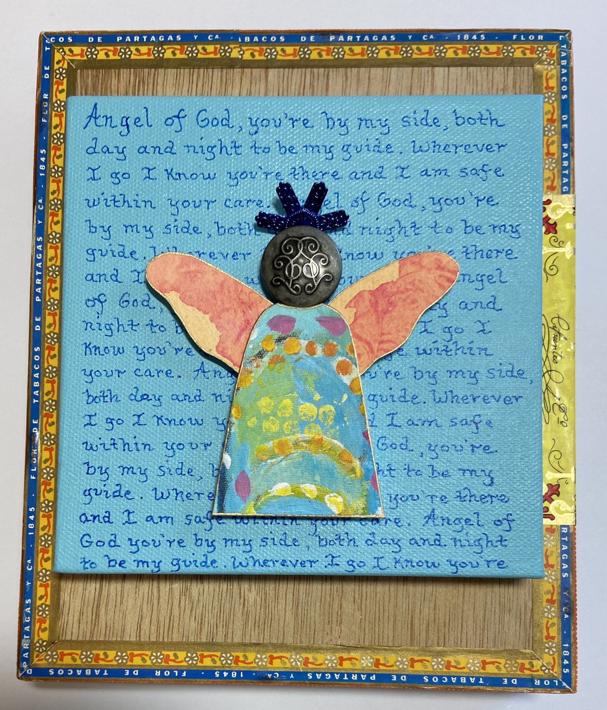 This Angel is 3 dimensional, placed on a canvas that is attached to the back of a cigar box. She hangs on the wall or can sit on a countertop/dresser. Measures 7 1/4" x 8 3/4".