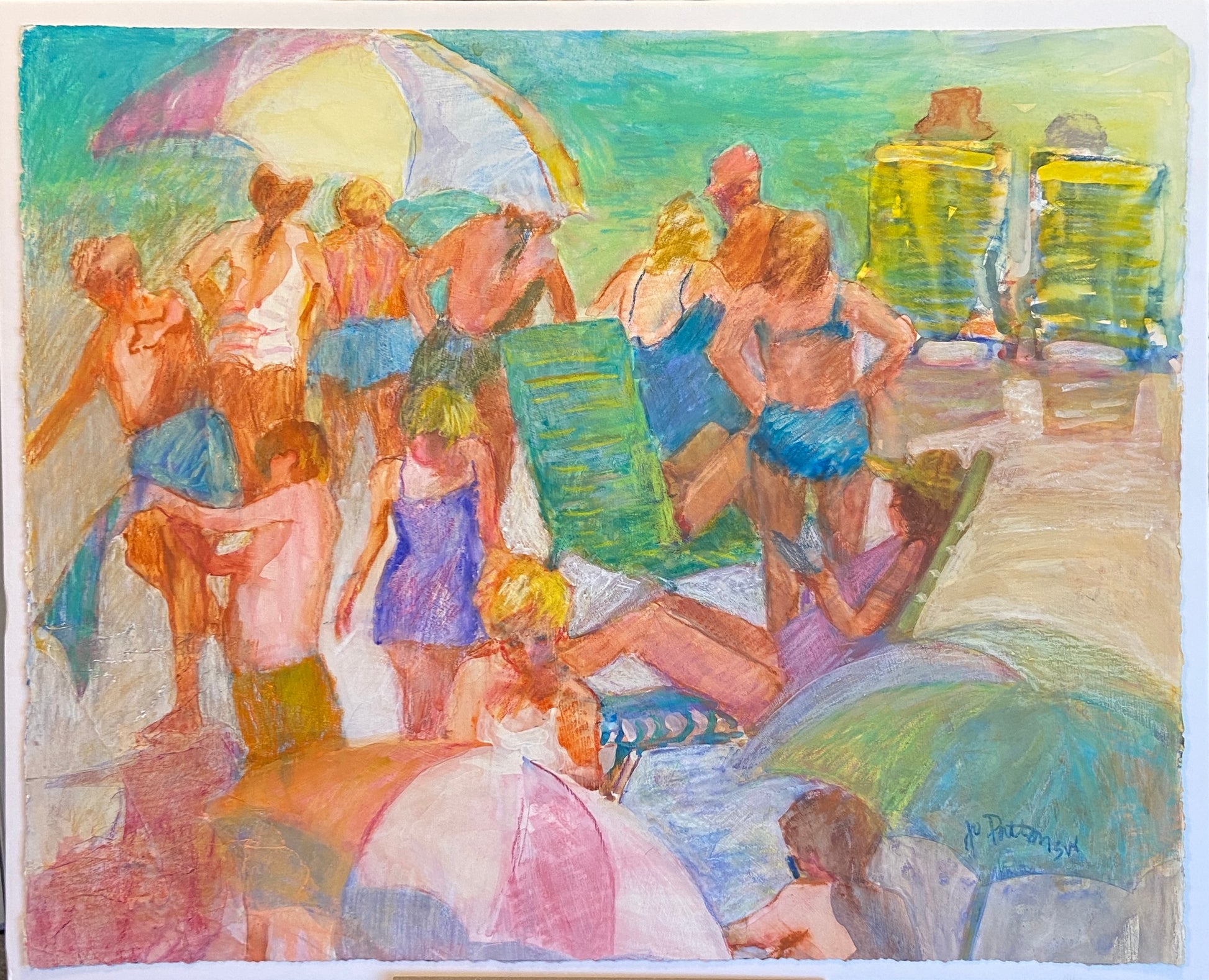 Colorful Beach Scene, by Jo Patton. Mixed media on watercolor paper, unframed with raw edges. Measures 22.5" x 18".